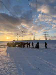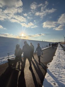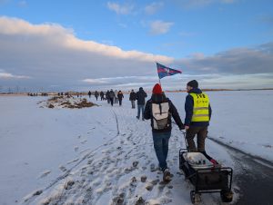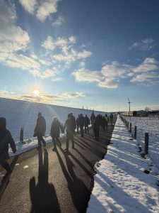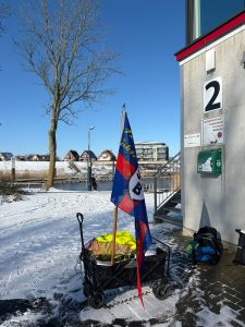 Frisch motiviert ging es anschließend Richtung Elbehafen, weiter am AKW vorbei und schließlich in Richtung Büttel. Langsam drängte die Zeit – und der Untergrund wurde anspruchsvoller: Pfützen, Eisstellen, Deich- und Rasenpassagen verlangten allen noch einmal Konzentration ab. Der Bollerwagen zeigte sich dabei etwas träge, hielt aber tapfer bis zum Ziel durch.
